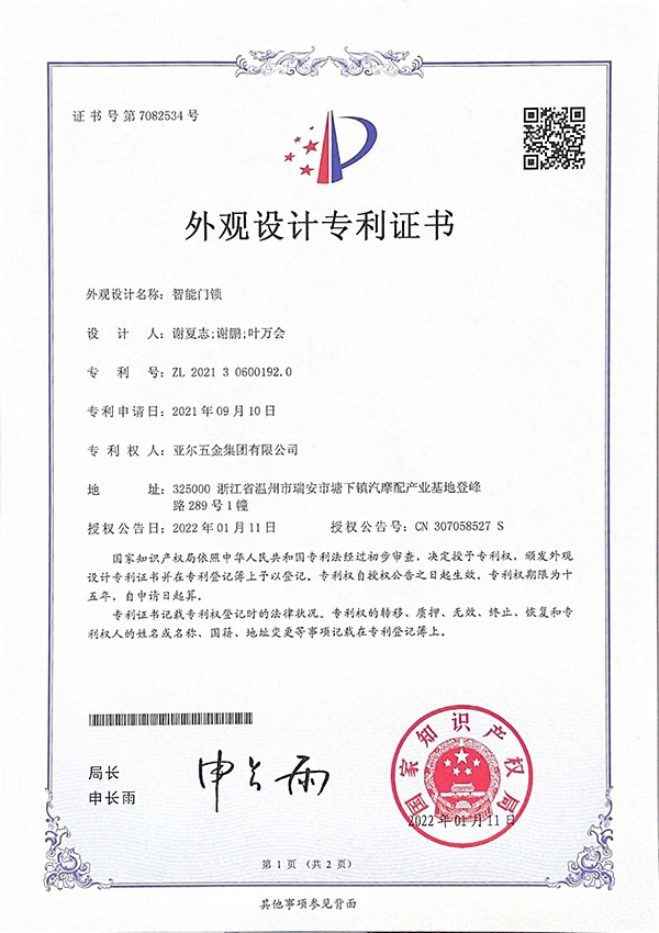 智能門鎖外觀設(shè)計(jì)專利證書