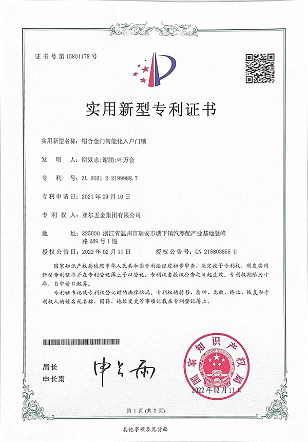 鋁合金門智能化入戶門鎖實(shí)用新型專利證書