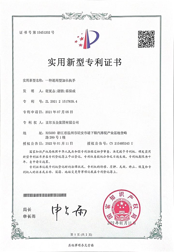 一種通用型加長(zhǎng)執(zhí)手實(shí)用新型專利證書